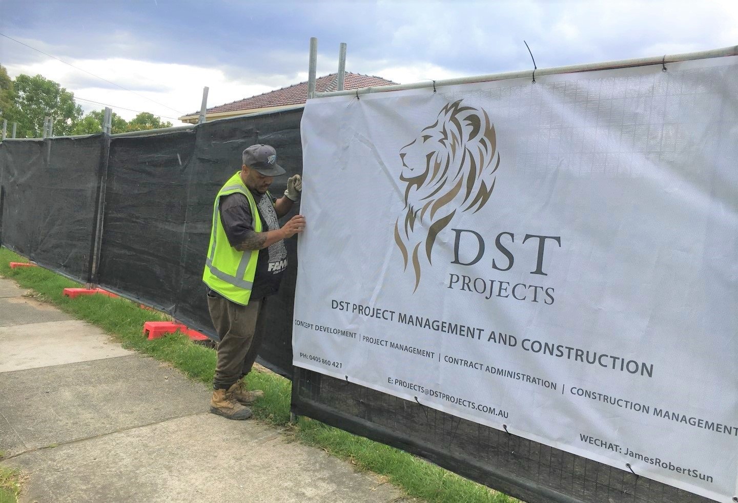 A construction worker in a high-visibility vest installs a site banner displaying the DST Projects logo with a lion symbol. The banner reads “DST Project Management and Construction” and lists services including concept development, project management, contract administration, and construction management.