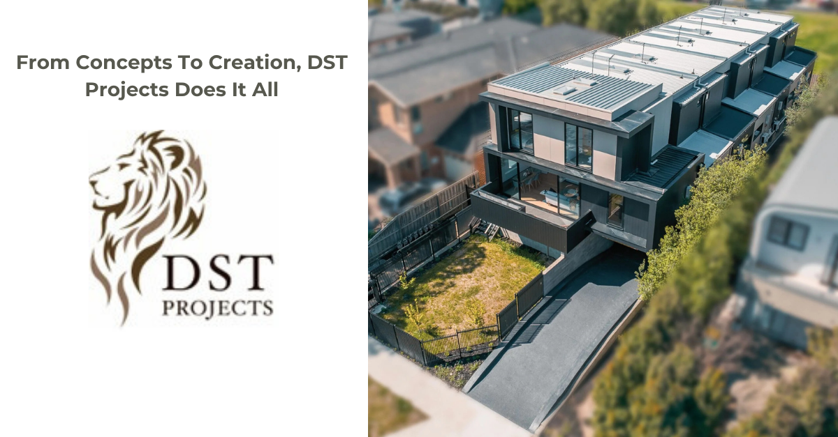 A modern architectural building beside the title text ‘From Concept to Creation — How DST Projects Delivers Architectural Excellence’ on a dark blue background, symbolizing innovative design and precision construction by DST Projects.